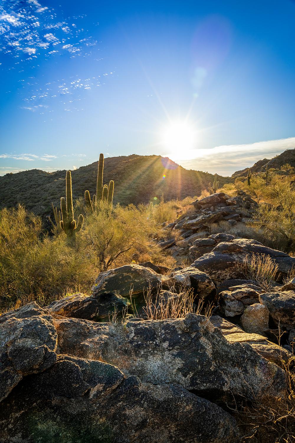 Hiking in South Mountain, located just south of Phoenix, Arizona, is especially beautiful in the morning. A must-see spot is Dobbins Lookout, which offers stunning views. The photo's beauty is highlighted by the unique rocks and vibrant plant life.