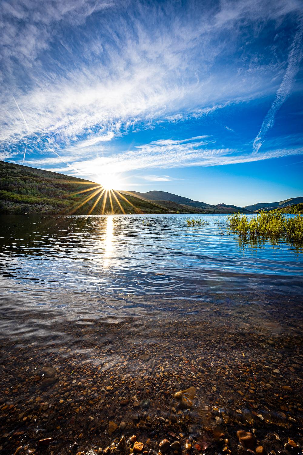 Embrace the tranquil beauty of dusk over East Canyon Reservoir near Salt Lake City, Utah, with this captivating photograph. As the sun sets behind the hills, its last golden rays cast a gentle glow over the calm waters, creating a serene and reflective atmosphere. The clear sky, adorned with delicate wisps of clouds, mirrors perfectly on the reservoir’s surface, enhancing the sense of peace and quietude. This image captures the soothing transition from day to night, making it a perfect piece to bring a touch of natural calm and elegance into any space. Let the twilight serenity of East Canyon Reservoir inspire and soothe your senses.